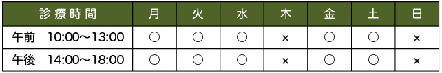 診療時間は、午前10時から午後6時までです。土曜日も診療しております。